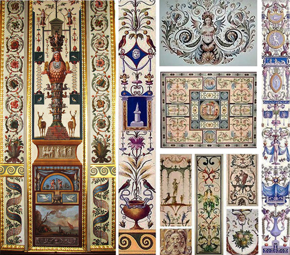 Гротески – это симметричное причудливое переплетение выполненных из стюка рельефных мотивов (орнаментальных, реальных и выдуманных растений, животных, людей, фантастических существ и проч.) и живописных (фресковых) вставок.