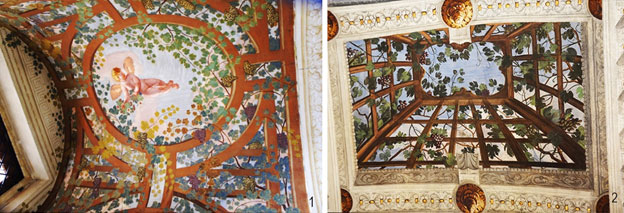1. Роспись над коридором. Фреска Д. Б. Дзелотти на вилле Эмо. Арх. А. Палладио. 1558–1559 гг. 2. Роспись «Пергола». Фреска П. Веронезе на вилле Барбаро. Арх. Палладио. 1558–1560 гг.
