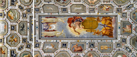 По мере эволюции Ренессанса легкие живописные вставки превращались в крупные масляные полотна, рамы становились объемнее, а поля межу картинами заполняли «погрузневшие» гротески со скульптурным орнаментальным декором. При этом в композиции потолка важна была жесткая симметрия (см. ил. 26). Подобный прием станет популярным в маньеризме.