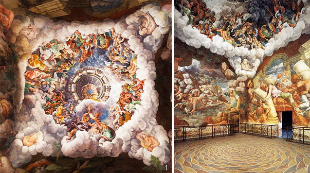 В зрелом Ренессансе, а затем и в маньеризме иллюзионистические потолочные росписи много разнообразнее, а прием с центральным проемом наружу станет весьма популярным. Например, громоздящиеся архитектурные «обманки» с колоннами, карнизами, балюстрадами (и даже с людьми за ними) и т. д. обрываются в центре «прорывом в небо», где разворачивается своя небесная история (см. ил. 17).