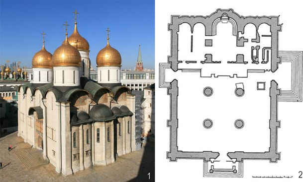 Т. е. в Успенском соборе нарушена традиционная центрическая композиция с куполом над центром сакрального пространственного креста. Более того, в нем нет хор. Утративший сакральные пространственные характеристики, хорошо освещенный интерьер кремлевского Успенского собора более напоминал просторный зал светского характера. Это немедленно отметили современники, которых храм изумил «величеством, и высотою, и светлостью, и звонкостью, и пространством; такова же прежде того не бывало в Руси» (Воскресенская летопись). Да и снаружи он выглядел «яко един камень», поскольку апсиды в нем были искусно замаскированы.