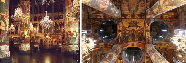 В композиции интерьера изначально был учтен высокий иконостас. Он должен был примкнуть к двум восточным столбам подкупольного креста, поэтому эти столбы получили прямоугольное сечение. В то же время два других и еще два дополнительных западных трактованы как круглые колонны. Фактически интерьер визуально поделен на две части – восточную, с протяженными алтарными апсидами, и квадратную западную, с четырьмя круглыми колоннами (ил. 53.2).