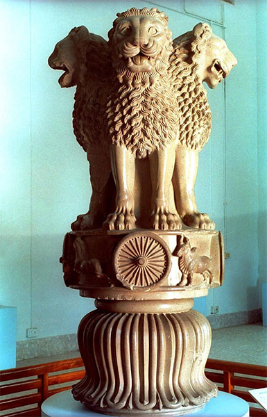 В ней четыре льва установлены на цилиндрическом постаменте, который покоится на перевернутом лотосе; прежде над спинами львов возвышалась еще чакра – вращающееся колесо мироздания. Такие же чакры изображены на поверхности круглого постамента; между ними – буддийские символы сторон света, представленные в виде фигурок зверей: льва (север), лошади (юг), быка (восток), слона (запад). Львиная капитель как символ величия древнего государства стала гербом современной республики Индия.