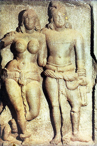 И вновь в одном памятнике последовательно воплощены, сменяя друг друга, две взаимоисключающие идеи: реальные земные радости – это объемная чувственная пластика, в разных своих ипостасях представленная на стенах вестибюля и в капителях колонн, и аскетизм, отказ от земных страстей, что передано отполированными, лишенными всякого декора поверхностями ступы, стен, пола. Как в композициях ступы и торана, можно предположить, что в этом противопоставлении закодирована буддийская истина: путь к нирване связан с отказом от страстей и желаний.