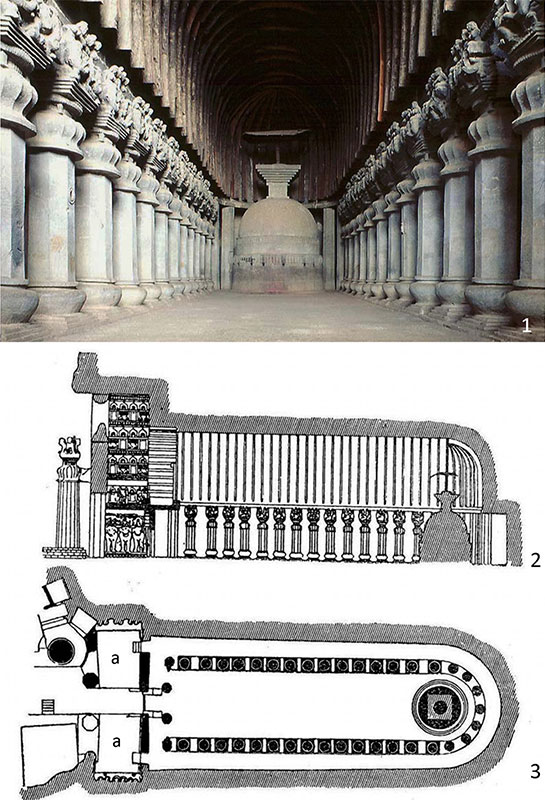 Чайтья в Карли – это вырубленное в скале помещение протяженностью ок. 40 м (в литературе этот размер колеблется от 38 до 42 м), которое завершается полукруглой нишей. В нише, частично выступая вперед, находится храмовая святыня – ступа, также вырубленная из сплошной породы камня. Т. е. храм состоит из расположенного в глубине святилища со ступой и зала для молящихся перед святилищем (ил. 9).