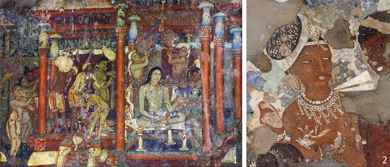 1. Царь совершает омовение. Роспись в вихаре № 1. 2. Фрагмент росписи в вихаре № 17