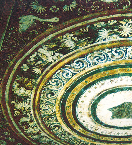 В росписях потолков, в обрамлениях дверей и ниш использованы орнаментальные композиции, в частности, цветочные орнаменты с характерными натуралистичными изображениями цветов (ил. 14).