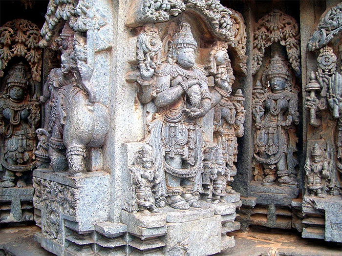 5. Все поверхности индуистских храмов снаружи и внутри обильно покрыты пластическим декором (порой внутренняя пластика может отсутствовать). Декоративных скульптурных и рельефных форм и мотивов множество, в них «ликует и клубится» во всем своем многообразии и изобилии «земная» чувственная жизнь. Соединение чувственного многообразного и изобильного декора с живописным объемом храма создает образы яркие и эмоциональные.