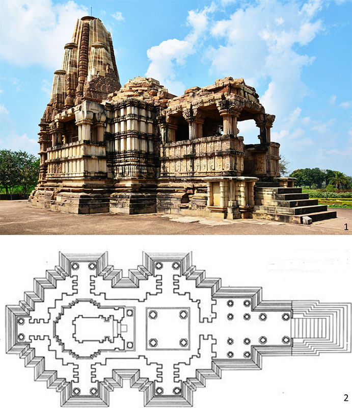 Один из лучших индуистских храмов эпохи Средневековья – храм Кандарья-Махадева в Кхаджурахо (950–1050 гг., по другим данным 1017-1029 гг.). Высотой 35,5 м и длиной 33,2 м, он предстает как изваянное целое, по словам исследователя, как «гигантская скульптура-миф»; композиция храма ориентирована по оси восток–запад; наружная лестница подводит к входному портику, расположенному с восточной стороны (ил. 20.1).