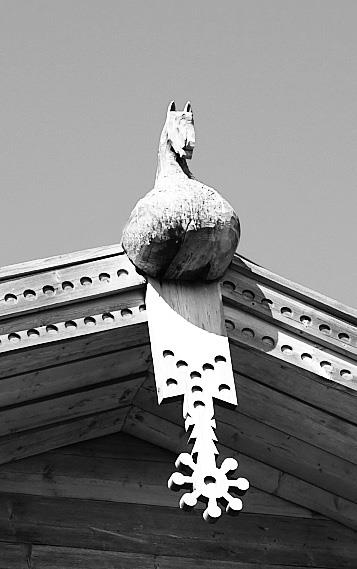 Шаровидная грудь конька солнцеподобна. Резное «полотенце» избы изображает «громовик» в виде солнца с восемью лучами.