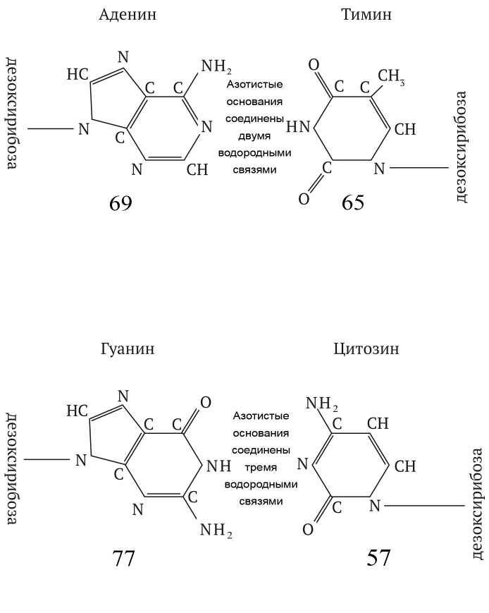 На схеме можно увидеть какие-то цифры. Эти числа показывают сумму электронов каждого азотистого основания, входящего в ДНК. В аденине общее количество электронов – 69, в тимине – 65, в другой паре гуанин содержит 77 электронов, цитозин – 57.
