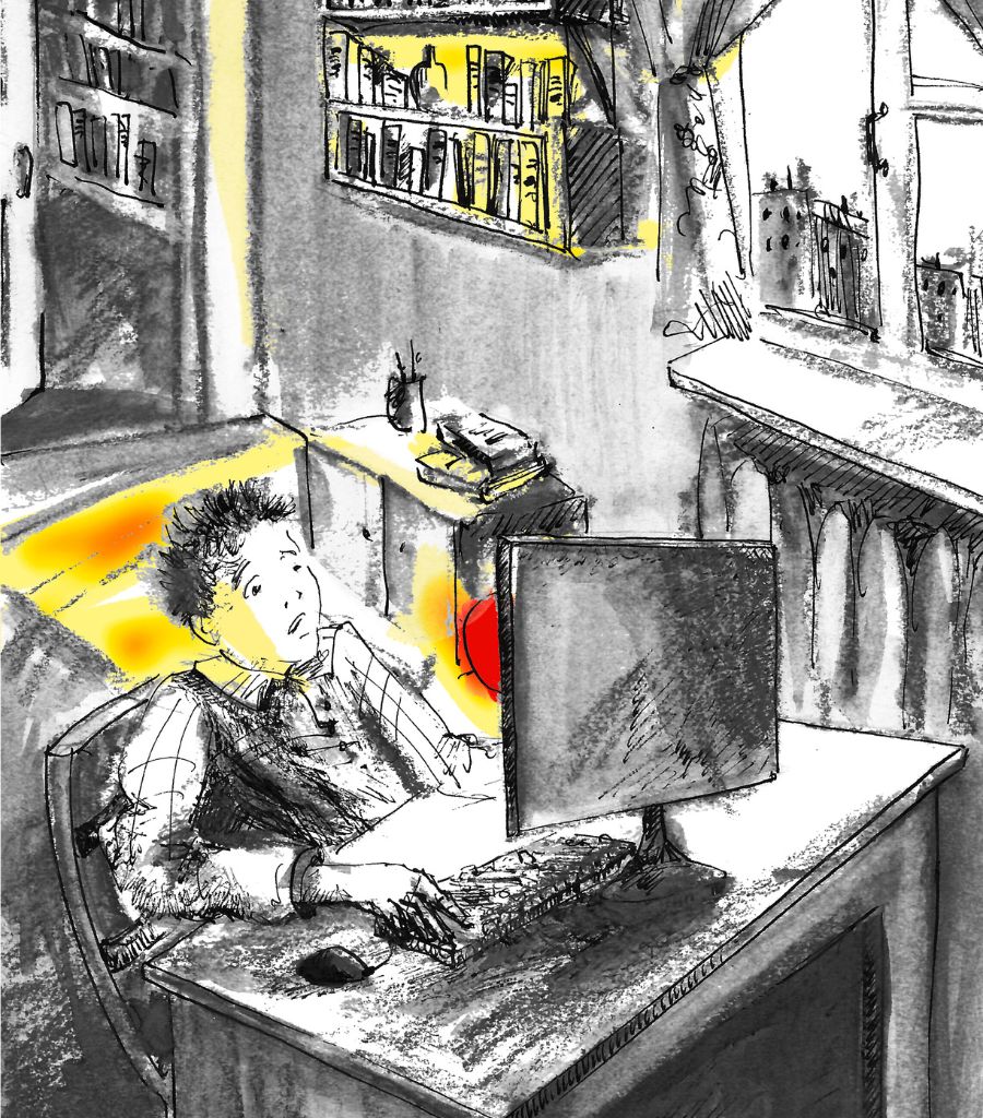 В эту минуту яркий красный шар отделился от монитора компьютера и, словно по волшебству, завис в воздухе. Комната наполнилась огненным свечением. Все вокруг окрасилось в алый цвет. Саня вжался в кресло, а внутри его боролись страх и любопытство. Шар повисел немного в воздухе над Саниной головой, а потом медленно поплыл к книжным полкам, висевшим на стене.