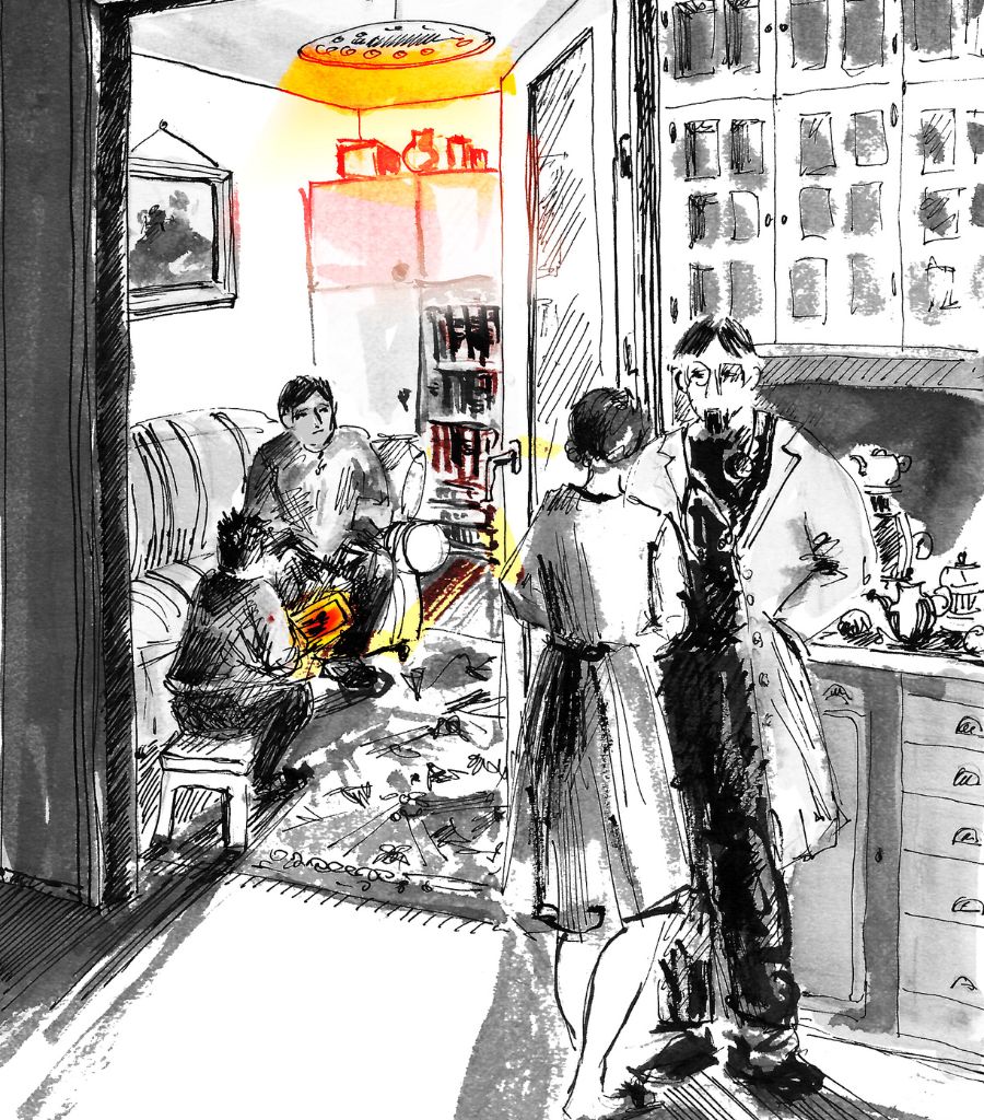 Доктор продолжал разговор папой в гостиной. Саньке было любопытно посмотреть на своего старшего/младшего брата, в которого, как сказала мама, превратился его отец. Санькина мама прикрыла двери в гостиную и отправилась в аптеку. Санька подошел к гостиной и начал вслушиваться в голоса, доносившиеся оттуда.