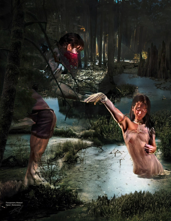 – «О, это ты снова, что полыхал вчера огнём» – увидев его подумала она и глазами милыми на него смотрела. – «Так ты не отказался от неё?!» Герон посмотрел ещё раз на избу и вытащив ремень, связывает, к корню дерева свою ногу. Бросается к ней на помощь тут же, и тянет красотку он из болота.