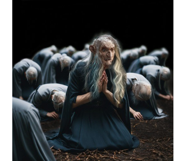Царицы входит в эту тьму, подобно дворцу она была, но без света и во мрак погружена. От царицы шёл белый свет и куда она вступала, то её след там факелом стало. Перед нею двадцать пять колдуний стояли на коленях и в поклоне головы у них, глаза как сливы были в наружу, ели видны волосы на головах и те седые, когти как мечи и челюсти огромны, обвисла кожа на лицах, и носы достигли подбородка.