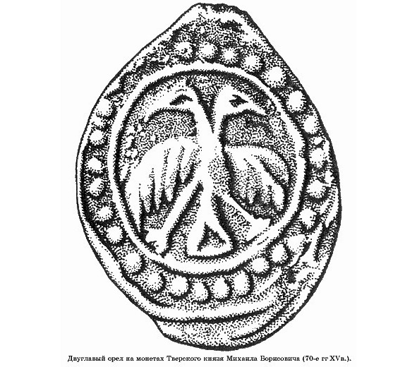 Исследователи отмечают, что впервые на Руси двуглавый орёл появился во второй половине XV века, на монете Великого князя Тверского Михаила Борисовича (1453—1505), великий князь Тверской (1461—1485).