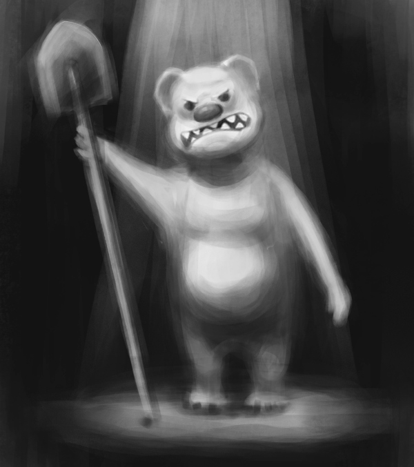Отпустил его медвежонок и сел за стол мед доедать. Всю баночку меда съел, мордочку вытер и вышел из дому. По пути встретилась медвежонку белочка и спросила, как там зайчик поживает. Заплакал медвежонок и сказал, что зайка от тоски с ума сошел, убил скворца, а сам удавился. Ахнула белочка и хотела было в дом зайки побежать, но схватил ее медвежонок и в свой кирпичный домик отнес. Привязал к стульчику и думать стал, что с ней делать. Хотел сначала задушить белочку, но понял, что надоело ему это. Размышлял медвежонок, размышлял, да и домыслил: прошел в сарай рядом с домом и лопату взял. Пришел к белочке и отсек ей лопатой голову. Покатилась белочкина голова по полу, а медвежонок схватил ее и принялся ею, будто мячиком, играть.