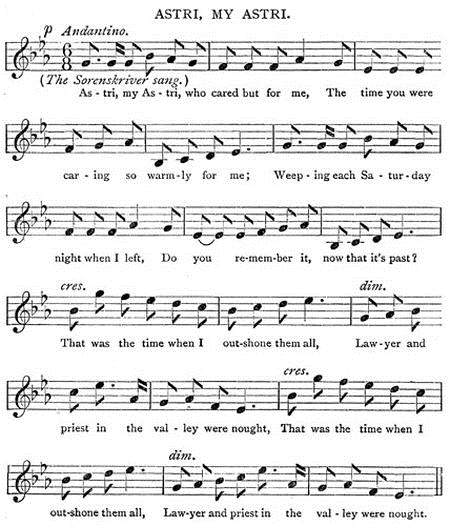 The time you were caring for Astri alone,Was the time when that Svanaug you cared not to see;The time when your steps were so active and brisk,Hastening to greet me each Saturday eve.That was the time when no riches on earth,Fair could have seemed without my sweetheart's love.That was the time when no riches on earth,Fair could have seemed without my sweetheart's love.He returned with two jugs of milk. A merry laugh sounded after him, and he was smiling too. The saeter-door was divided into two parts, and he shut the lower half to keep out the draught; and when the old woman tried to slip away, leaving her guests to enjoy themselves in their own fashion, he said: