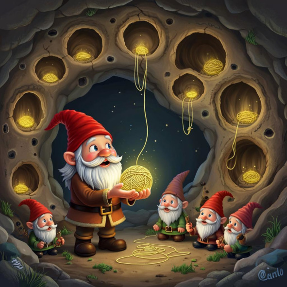 Когда Трынь вновь пришёл к дыре один дырка раскрылась для него. С тех пор Трынь стал Хранителем Нити, а его дырочка – особым местом в Долине. Каждую ночь туда стекался шёпот леса, снов животных и дыхание мира. И если прислушаться очень-очень внимательно в самую тихую ночь, можно услышать, как гномики в земле поют свою старую песню: