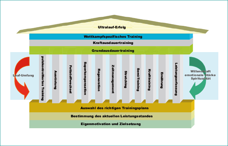Willenskraft, emotionale Stärke, Spiritualität: Neben der Ausdauerfähigkeit sind die Willenskraft, die emotionale Stärke und die Spiritualität entscheidend für den Ultralauf-Erfolg. Der Verstand ist der sogenannte »innere Schweinehund«. Der Wille kämpft gegen den Verstand an, um Krisen zu überwinden und das Ziel zu erreichen. Die emotionale Stärke beeinflusst den Willen mit einer Kraft, die aus dem Unterbewusstsein kommt. Die Willenskraft und die emotionale Stärke ermöglichen ein Widerstehen bei auftretenden Krisen.