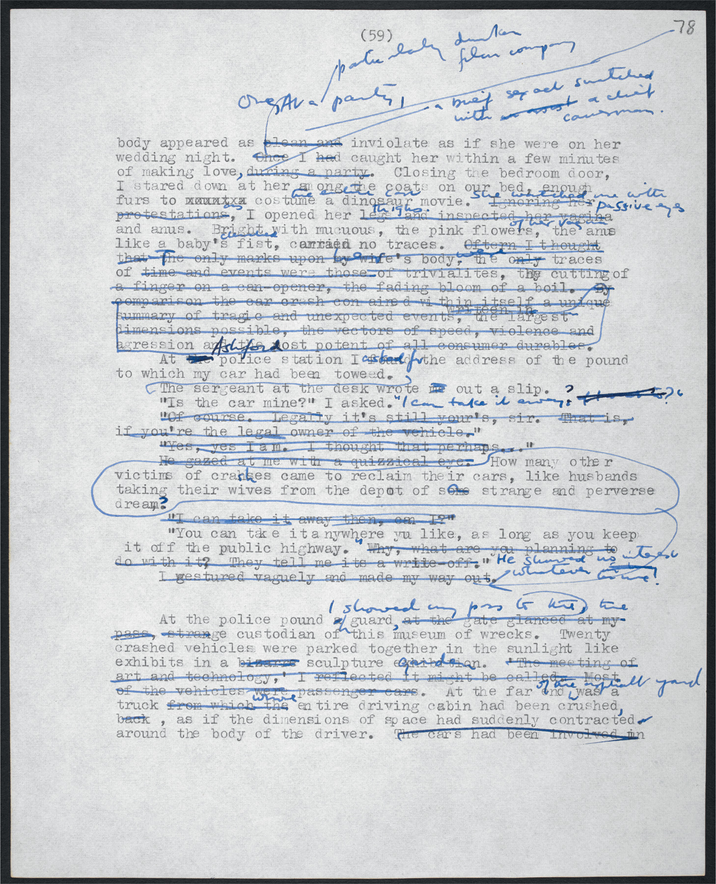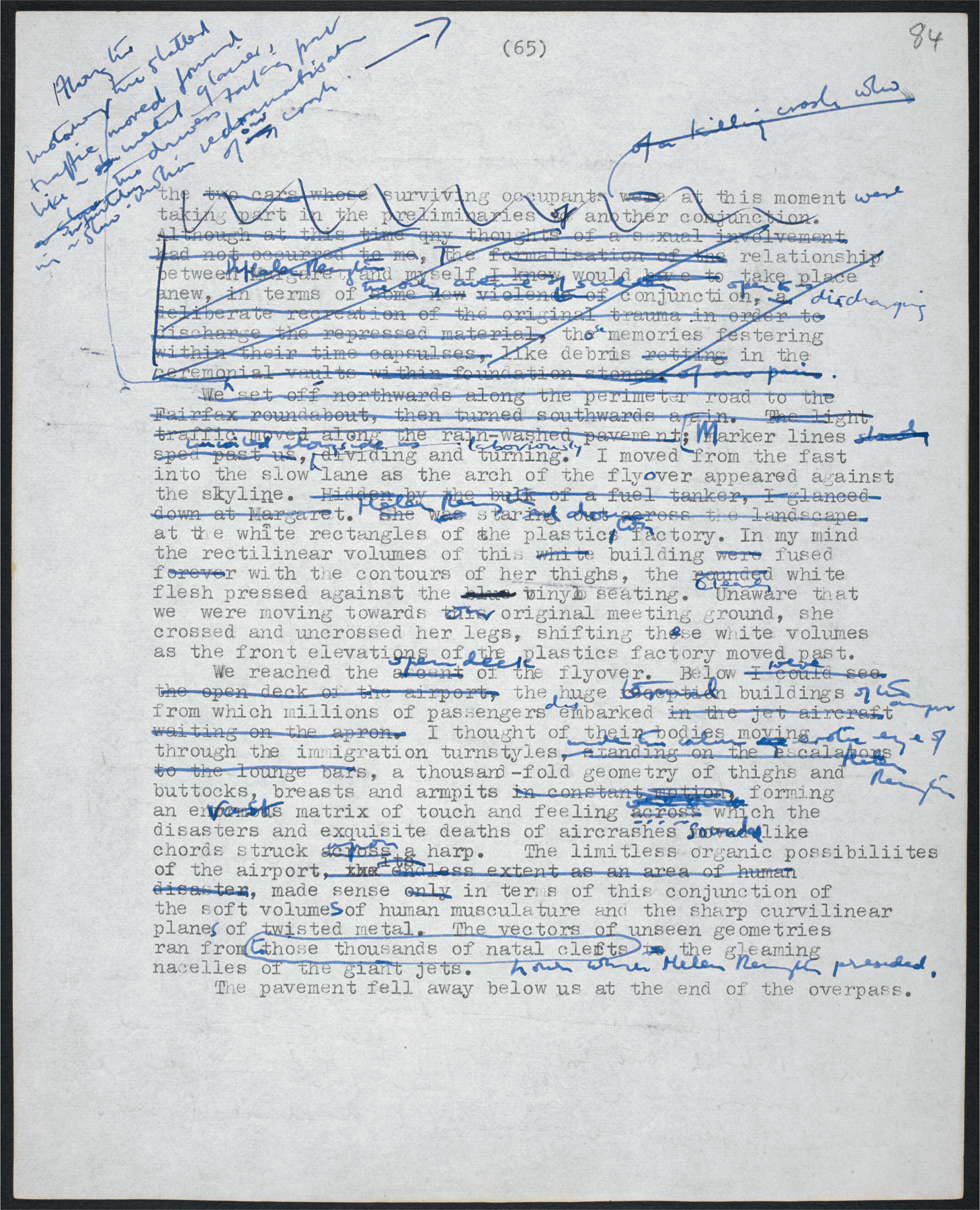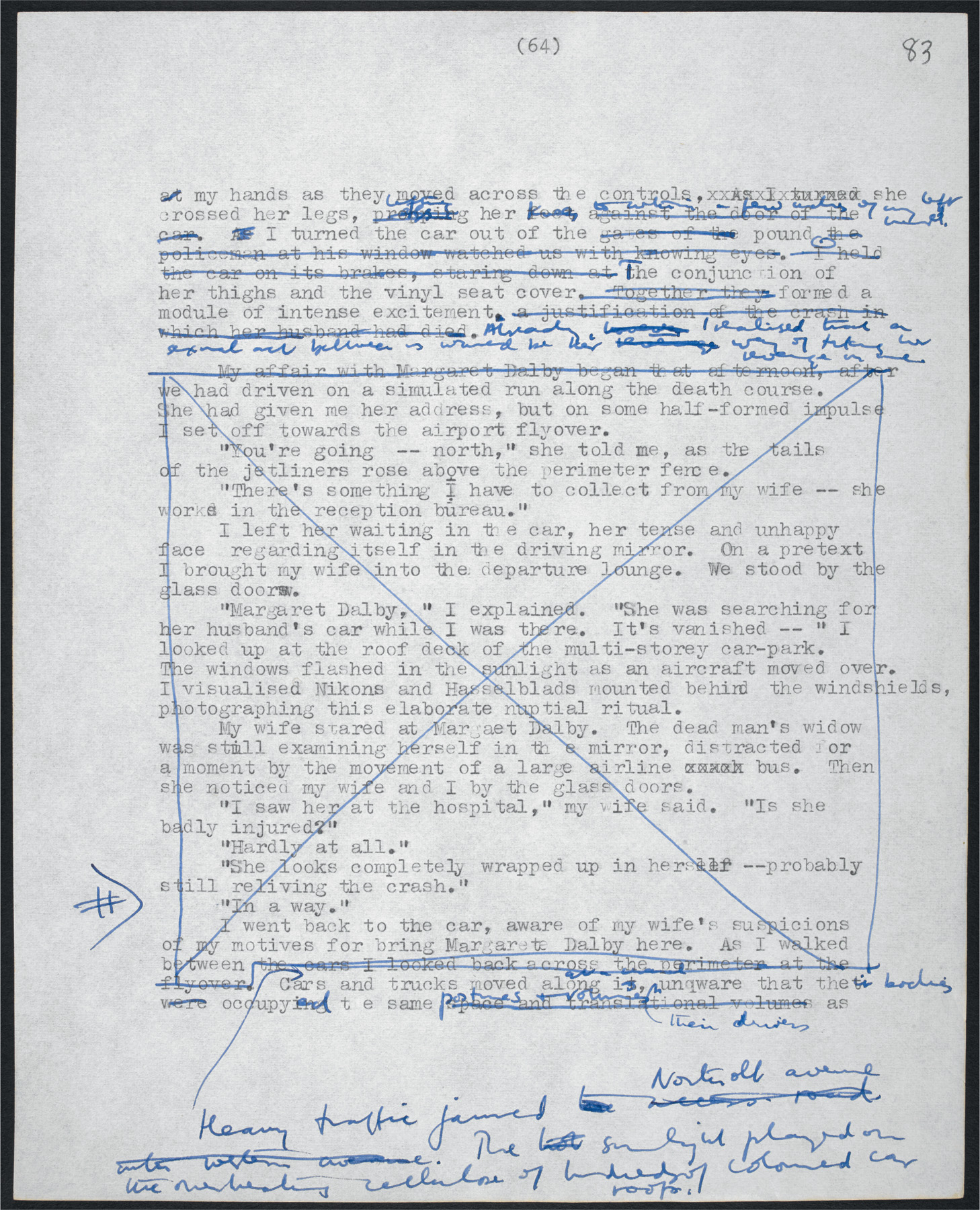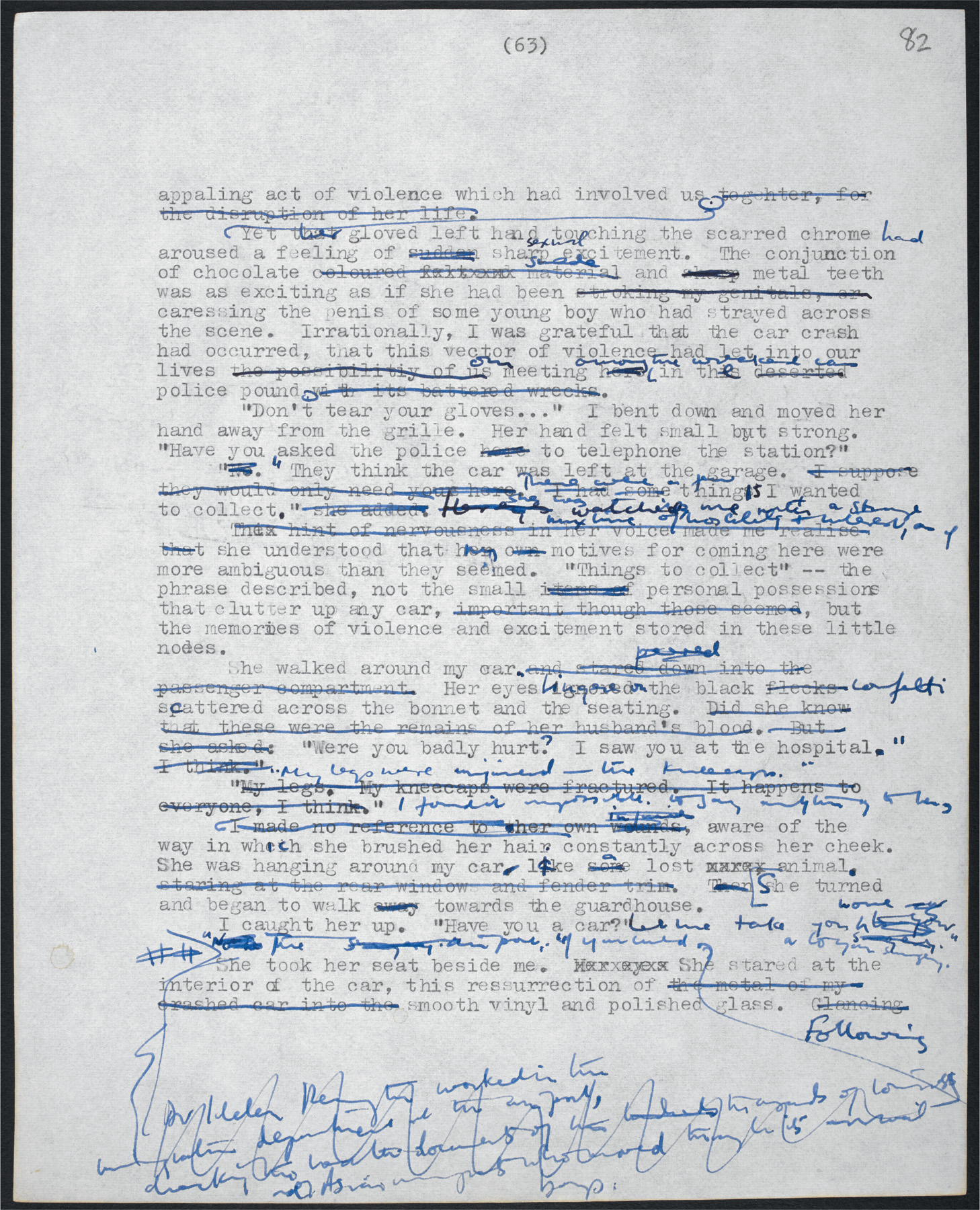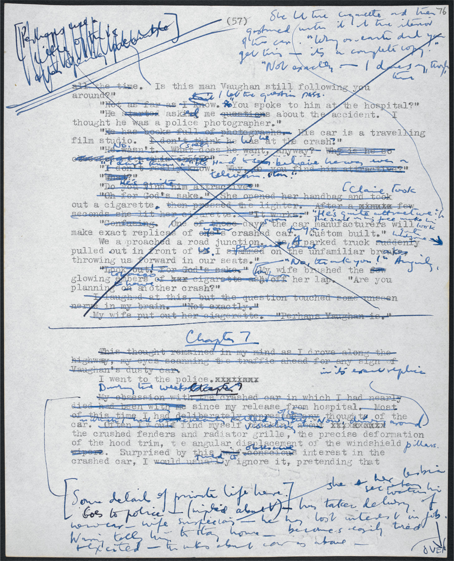 He stood by the balcony, looking down at the collision below. The headlamps illuminated the hard ridges of scar tissue above his eyebrows and mouth, the broken and re-set nose bridge. I remembered why Vaughan’s career had come to an abrupt end – halfway through his television series he had been seriously injured in a motorcycle crash. All too clearly his face and personality still carried the memory of that impact, some terrifying collision on a motorway in the North when his legs had been broken by the rear wheels of a truck. His features looked as if they had been displaced laterally, reassembled after the crash from a collection of faded publicity photographs. The scars on his mouth and forehead, the self-cut hair and two missing upper canine gave him a neglected and hostile appearance. The bony knuckles of his wrists projected like manacles from the frayed cuffs of his leather jacket.