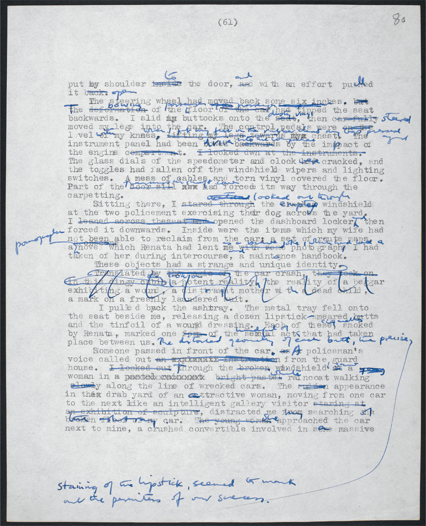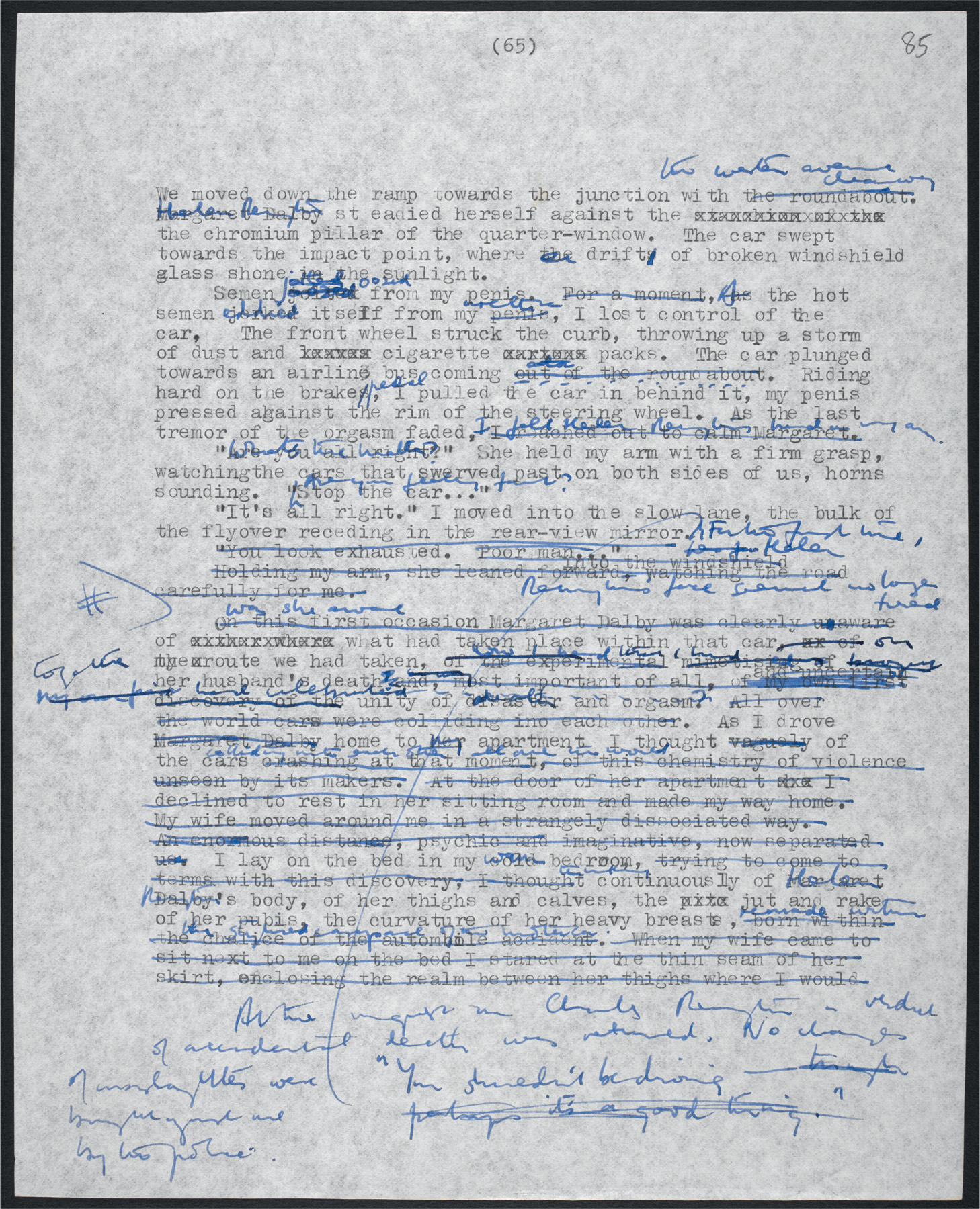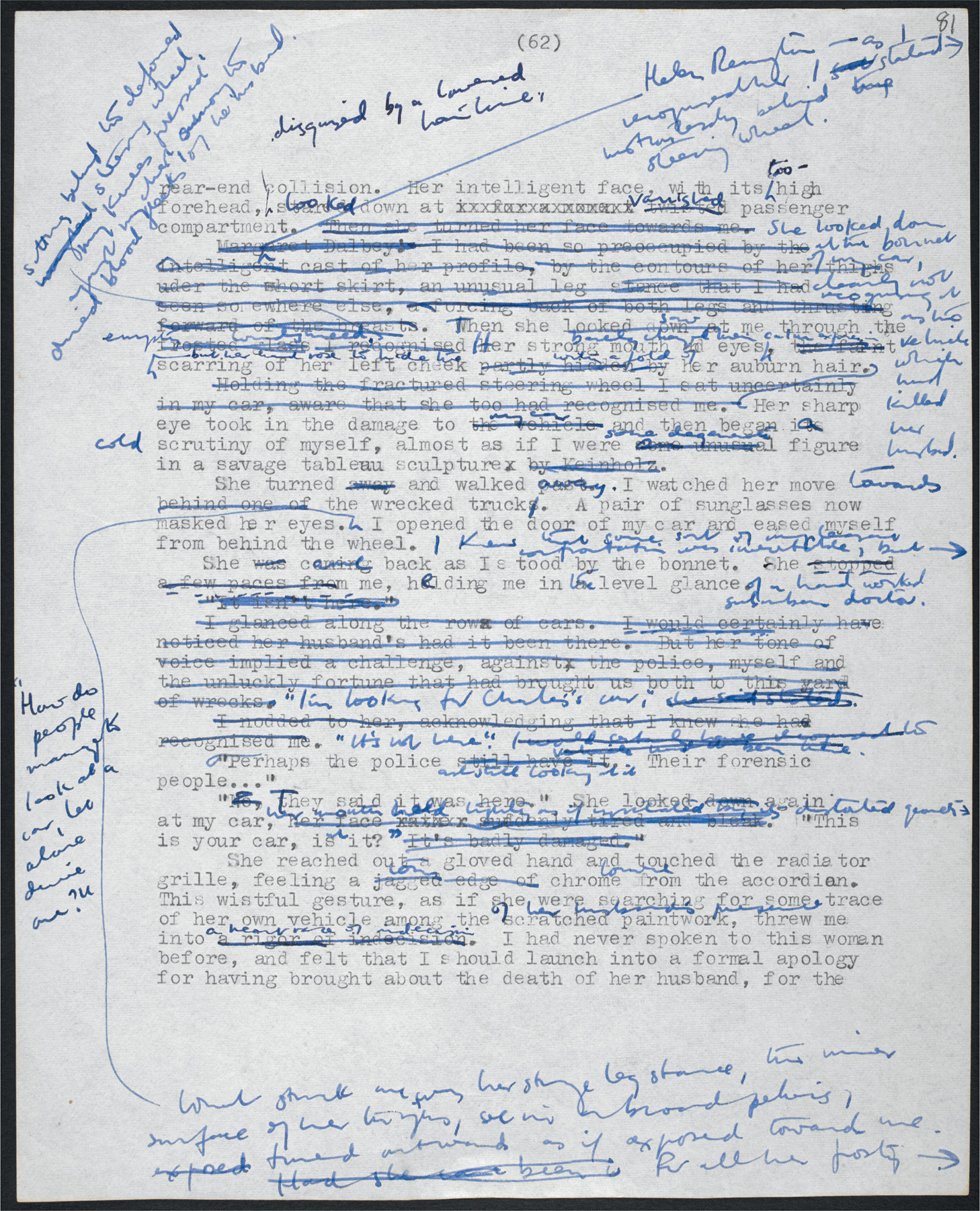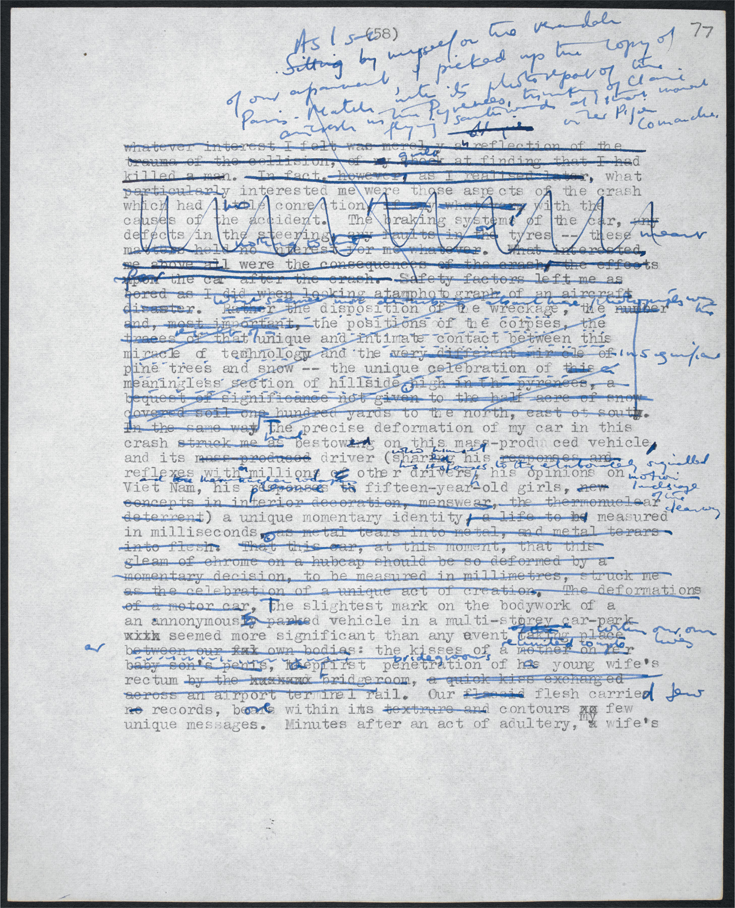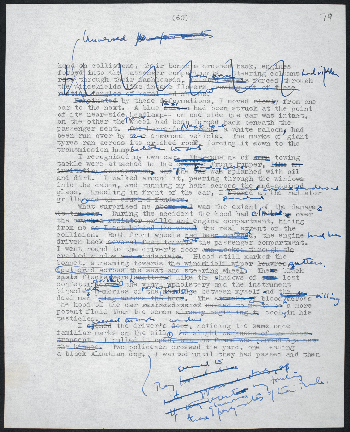 He stood by the balcony, looking down at the collision below. The headlamps illuminated the hard ridges of scar tissue above his eyebrows and mouth, the broken and re-set nose bridge. I remembered why Vaughan’s career had come to an abrupt end – halfway through his television series he had been seriously injured in a motorcycle crash. All too clearly his face and personality still carried the memory of that impact, some terrifying collision on a motorway in the North when his legs had been broken by the rear wheels of a truck. His features looked as if they had been displaced laterally, reassembled after the crash from a collection of faded publicity photographs. The scars on his mouth and forehead, the self-cut hair and two missing upper canine gave him a neglected and hostile appearance. The bony knuckles of his wrists projected like manacles from the frayed cuffs of his leather jacket.