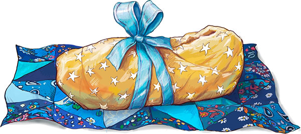 Очень осторожно Аришка, а вместе с ней Кот и Домовой, начали подкрадываться к кровати. Ну мало ли что за неприятность может там поджидать?! Аришка с опаской подобралась к свертку. Туда же запрыгнул и Кот, но было видно, что он не спешит заглядывать внутрь. Домовой посмотрел на друзей, чуть вздохнул и отогнул тряпичный край свертка…