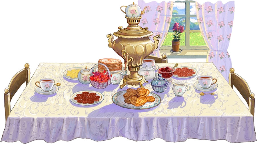 Кот собрался что-то возразить, но в этот самый момент дверь резко распахнулась, и в кухню сначала «вплыл» пузатый Самовар, который нес Дедушка Саша, а потом появилась и Бабушка Зина. Самовар торжественно водрузили на стол.