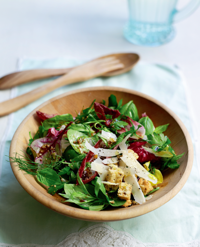 3 Dress the leaves, but don’t drown them. Serve immediately - once dressed, try not to let the salad sit around for too long, or the leaves will go soggy. If you like, scatter over some wholemeal (whole-grain) croutons, toasted pine nuts or flakes (slivers) of Parmesan.