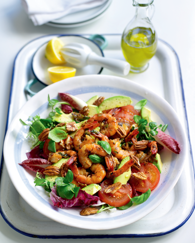 2Arrange the salad leaves, watercress, avocado and tomatoes in a big dish, then pour over the prawns and other cooked ingredients. Squeeze over the lemon juice, sprinkle with torn basil and pecan nuts and serve.