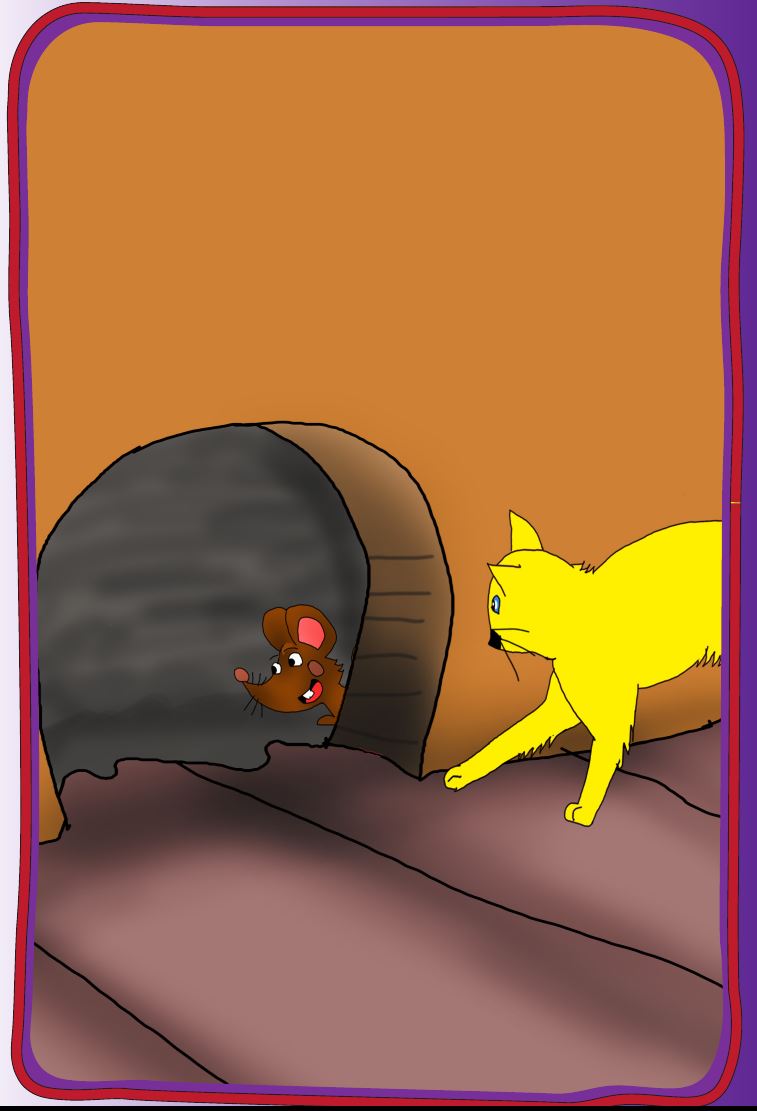 Sonra da kediyi, farenin bulunduğu tarafa doğru saldı. Fare, kediyi görünce hemen kaçmaya başladı. Kedi, peşinden koşturdu ama yakalayamadı, fare bir deliğin içine girip saklandı. Kedi deliğin ağzına pusu kurup oturdu. Bir müddet geçti, ses seda kesilmişti artık. Fare etrafına iyice bakındı, kediden ses yoktu hiç, beklemekten usanıp gittiğini varsaydı. Fare yavaşça delikten başını dışarı çıkardı, ama kedi onun bu sefer kaçmasına izin vermedi. Pençesini uzatıp fareyi yakaladı ve hemen karnını yardı.