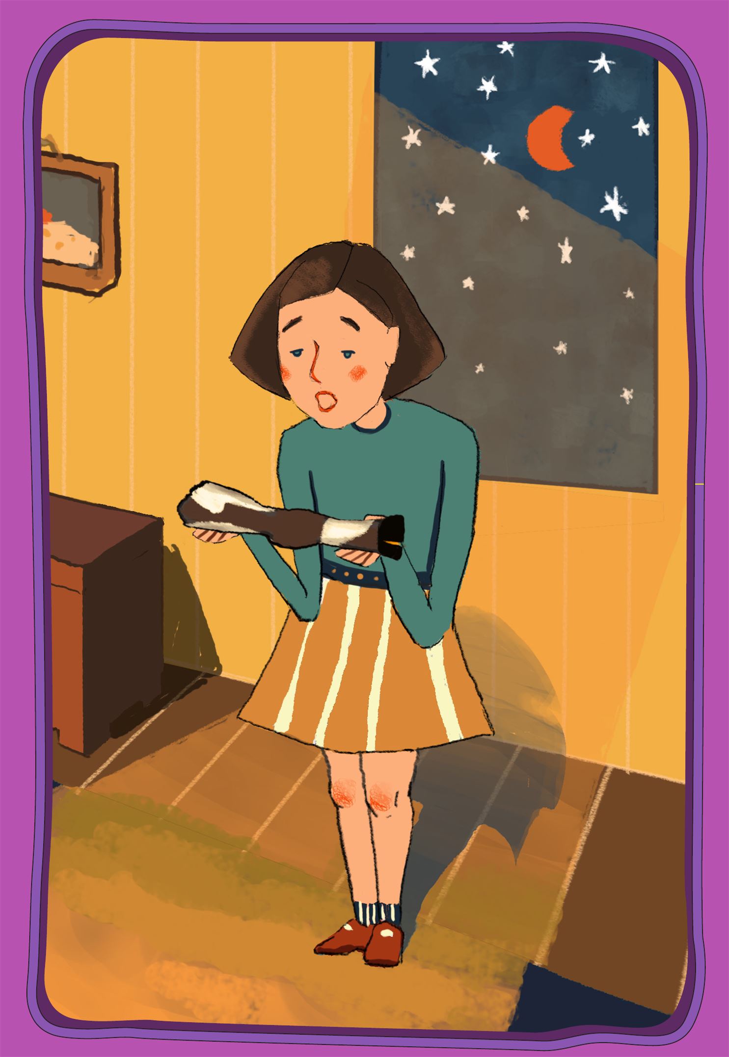 Hava iyice kararmıştı artık. Ulduz, bebeğini güçlükle görebiliyordu karanlıkta. El yordamıyla etrafa tutuna tutuna sandık odasından dışarı çıkabildi, lambayı yakabilmek için raftan kibrit almaya gitti. Ama kibrit, lambanın yanında değildi. Lambayı yere bıraktı ve diğer raftan kibriti almaya yöneldi. Ama birden ayağı yerdeki lambaya çarpıverdi, lambanın camı kırıldı, içindeki gaz yağı halının üzerine döküldü. Gaz yağının kokusu karanlığa karıştı ve odayı tümüyle doldurdu. Tam o anda kapı çalındı. Ulduz telaşlandı, eli ayağı birbirine dolandı. Konuşan Bebek sandık odasının kapı eşiğine kadar geldi ve kıza seslendi: