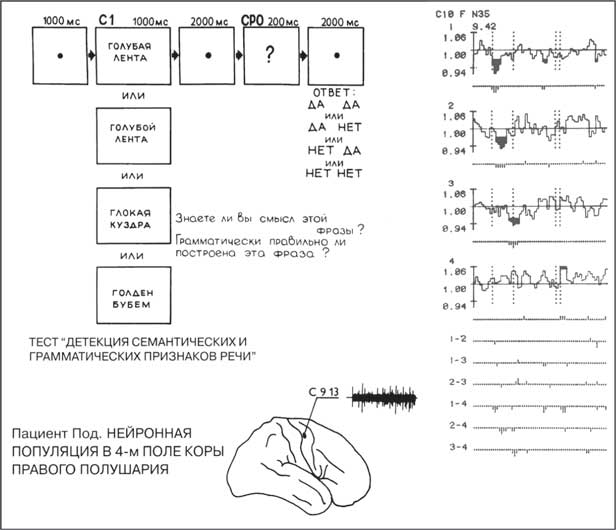 Можно исследовать ПСГ и тогда, когда обозначен не только первый стимул, но и последующие, и время команды к ответу. Хотя бы также вновь без расшифровки того, какой именно стимул, что именно за ответ задан в условиях задачи… Не все элементы (компоненты) ПСГ могут обнаружиться в каждой точке мозга, да и вообще может ни один из них не обнаружиться, это еще должно повезти. Но, однако, в любом случае при минимуме исходной информации суждение о содержании мыслительной деятельности по частотной динамике импульсной активности невозможно. Были у нас ранние исследования, скорее, лишь опорные, в которых изучалась динамика интервалов между разрядами. И все же кое-что интересное забрезжило в этих наблюдениях. На коротких отрезках записи (секунды, минуты) в словах, имеющих смысловую общность, в словах, которые могли бы быть обобщены каким-то другим одним словом, выявлялись одинаковые интервальные последовательности – из трех и более интервалов.