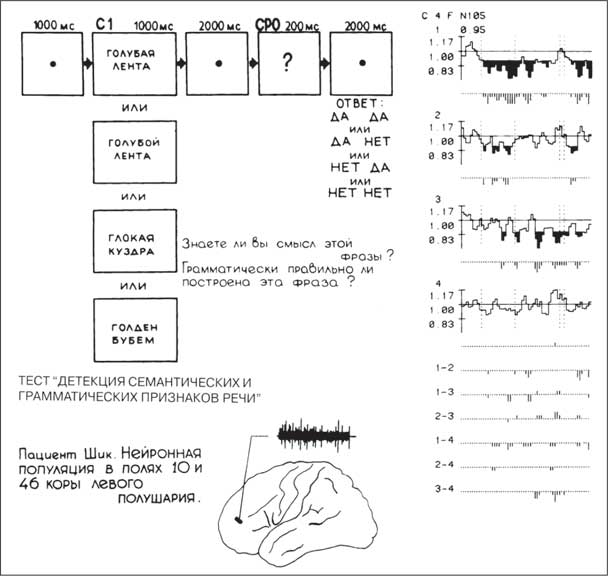 Тест «Детекция семантический и грамматических признаков речи». Пациент Шик. Нейронная популяция в полях 10 и 46 коры левого полушария. ПСГ частоты ИАН в поле 46 лобной коры левого полушария мозга человека при выполнении теста на детекцию семантических и грамматических признаков речи. Обозначения те же, что на рисунке на с. 72