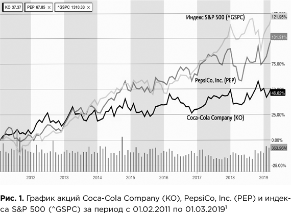 Результаты очень интересные. Почти за восемь лет акции Coca-Cola выросли на 46,6 %, а бумаги ее конкурента PepsiCo – вдвое больше: на 101,9 %. Но обе компании заметно отстали от остальных: индекс широкого рынка США S&P 500 за это время прибавил 122 %.