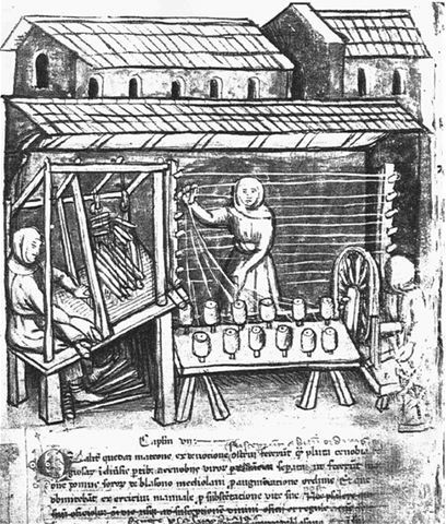 Средиземноморские сети обеспечили итальянских производителей относительно простым доступом не только к хлопку-сырцу, но и к «восточным» технологиям. Североитальянские предприниматели перенимали технологии у исламского мира – некоторые из них при этом ранее попали туда из Индии и Китая. В XII веке произошло «массированное вливание внешних технологий в европейскую текстильную отрасль» – в первую очередь прядильного колеса. До введения прядильного колеса в Европе в середине XIII века европейцы, как американцы и африканцы, пряли с помощью ручных веретен. Это был медленный процесс: искусная пряха выдавала около 120 метров нити в час. При такой скорости требовалось одиннадцать часов, чтобы спрясть достаточно пряжи на одну блузу. Прядильное колесо невероятным образом повысило выработку европейских прядильщиков, увеличив их производительность втрое. Таким образом, наличие нового материала – хлопка – привело к освоению нового метода производства, и поэтому в средневековой Европе прядильное колесо еще называли «хлопковым колесом». Не столь заметным, как прядильное колесо, но все же усовершенствованием стало использование горизонтального педального ткацкого станка. Впервые примененный в Европе в одиннадцатом веке, он позволил ткачу открывать и закрывать раствор зева – образующегося между нитями основы, чтобы дать пройти челноку, – с помощью ног, освободив руки для пробрасывания уточной нити, что позволило производить материю более высокого качества. Этот станок пришел в Европу из Индии и Китая через страны исламского мира[62].