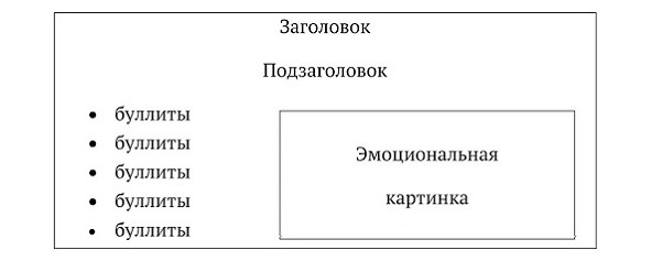 Структура презентации состоит из заголовка, подзаголовка, 3—7 буллитов (тезисов) и картинки.