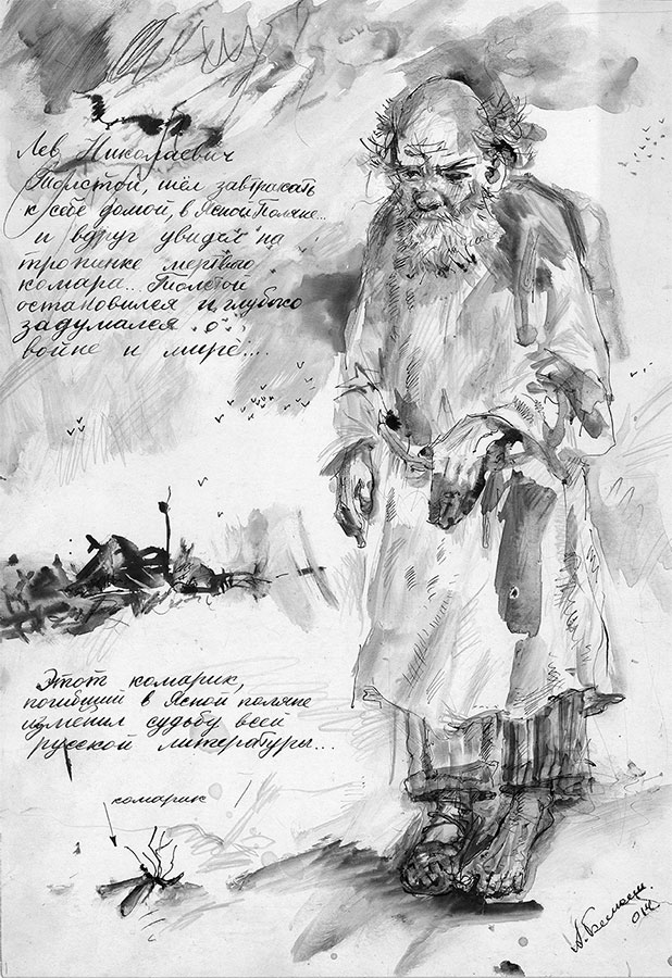 Прямо перед ним на тропинке, поджав лапки, лежал на спине мёртвый комар. Долго стоял Лев Николаевич, задумчиво глядя на неподвижное насекомое, и в голове у него возникали мысли о бренности, о ничтожно малых жизнях, о несоизмеримых величинах, о рождении и смерти, о мире и войне. Время как будто остановилось. Стал накрапывать дождь. Толстой смахнул каплю дождя с носа и, как пойнтер, поймавший запах куропатки, прямиком, через поле, рванул к дому. Мимо растерянной Софьи Андреевны, мимо накрытого к завтраку стола, мимо надоевшего Черткова, прямо к себе в кабинет…