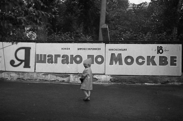 Вот как знаменитая песня из культового кинофильма зазвучала под челябинский снимок – с афишой фильма «Я шагаю по Москве». Читаем на афише, мимо которой прыгает малыш в плаще: новая широкоформатная кинокомедия с 18 июля. То есть пришла она к зрителю летом, как и сами события этой киноленты.