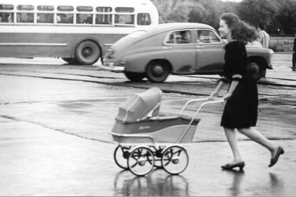 Вот улицу переходит молодая женщина с коляской. Какую – не скажу. Но то, что она оттуда – из 60-х – легко понять. И по модели коляски и по троллейбусу с автомобилем «Победа». И по улыбке на лице.