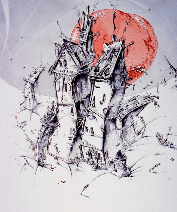 Техника раскрашивалась гуашью, от чего изделия больше напоминали настоящую технику. Еще – все же сын архитектора – Андрей смастерил из ящика, в таких отправляли посылки, комнату. Для этого одну стенку у ящика убрал, создал внутри планировку, стены покрасил, провел электричество – из маленьких лампочек, что были в фонарике. В таком жилище было вполне уютно маленьким «человечкам». Графические работы по-настоящему захватили молодого художника, когда он стал студентом архитектурного института – в начале восьмидесятых. Поступил на промышленную архитектуру. Рисовал прямо на лекциях, которые занимали большую часть дня.