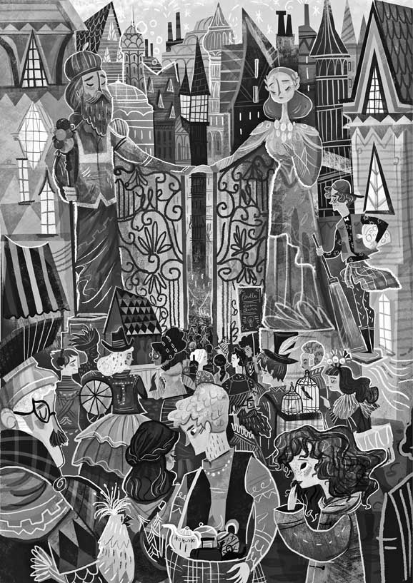 Все спешили к огромным железным воротам в дальней стене. Широкие петли крепились к двум статуям по обе стороны проема в скале. Их поднятые руки образовывали исполинскую арку. Одна статуя изображала статного мужчину в камзоле с гирляндой из апельсинов на шее, другая – элегантную женщину в платье, украшенном лимонами. Они выглядели не менее величественно, чем статуи древних богов, которые Иви видела у отца в музее. Та статуя, что с апельсинами, это сэр Клементс, – подумала она. – А другая, с лимонами, – леди Цитрон. Интересно, что сказал бы о них папа?