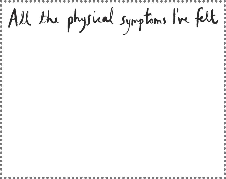 Write down all the physical symptoms of anxiety that you’ve experienced, heard about or googled (you know you’ve googled symptoms, don’t lie to this journal). Can be big or small. I’ll start with a common one.