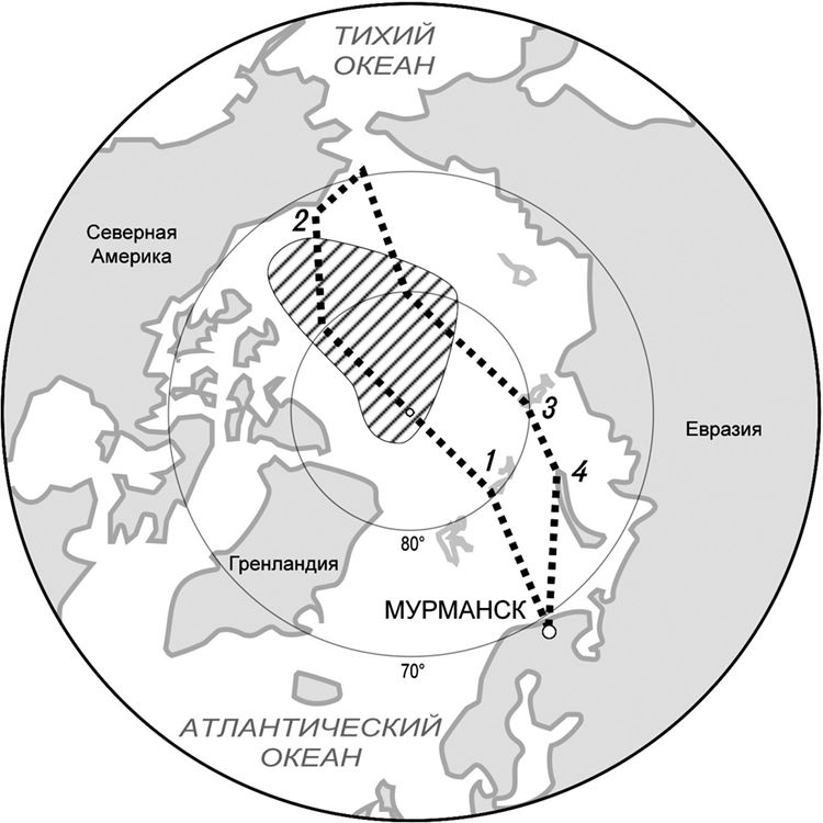 1 – западная оконечность Земли Франца-Иосифа; 2 – мыс Барроу на Аляске (крайняя северная точка Американского континента); 3 – Северная Земля; 4 – Новая Земля