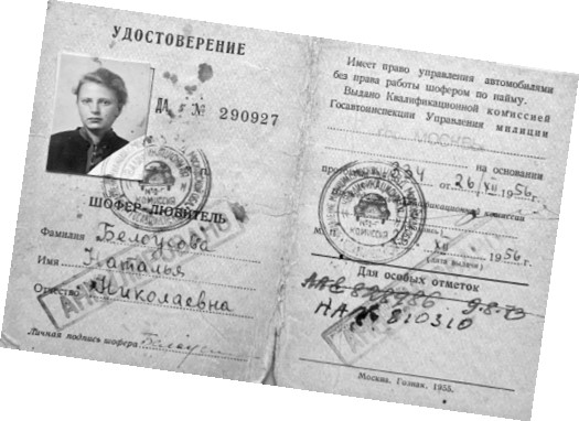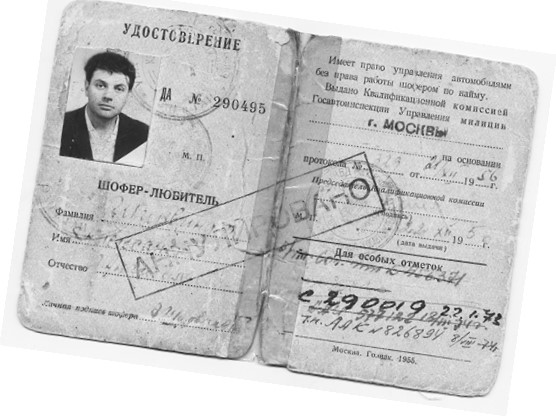 Потом моя 50-летняя мама решила научиться водить. Записалась в автошколу, сдала экзамены и получила права, но ездить за рулём боялась: когда она видела милиционера, ей становилось плохо. В то время как я училась на третьем курсе архитектурного института, в нём организовали курсы вождения, и я стала их посещать. Тогда надо было учить не только технику безопасности (тормоз, руль, поворотники), но и всю материальную часть. В результате экзамены я сдала на пятёрки. А Шура, сдававший тогда же, получил двойки и тройки, но, так как троек было на одну больше, ему тоже дали права.