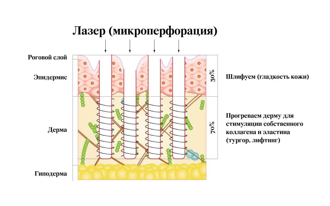 Фракционный термолиз – это процедура, во время которой лучи, подаваемые лазером, попадают в глубинные слои кожи, нагревая ткани. Такое воздействие запускает каскад восстановительных процессов и увеличивает скорость регенерации кожных покровов. По сути, осуществляется микроперфорация и шлифовка поверхностного эпителия, что придаёт гладкость коже, сокращает расширенные поры, убирает поверхностные пигменты, мелкую сеточку и морщинки. Говоря на простом языке, понятном рядовому обывателю, это можно сравнить с душем, проникающим в кожу, когда на одном её квадратном сантиметре образуется миллион микроколодцев. Около 30% кожи верхней части этих колодцев со временем отшелушивается, именно поэтому и требуется небольшой восстановительный период. А в оставшихся 70% вследствие прогрева дермы происходит стимулирование выработки коллагена и эластина.