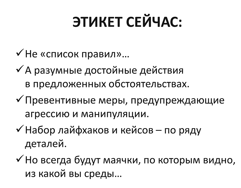 Кстати, категоричность в рекомендациях этикета: только так и никак иначе – признак некомпетентности. Именно по этому признаку вы легко вычислите ложных «специалистов» по этикету: без аргументов и сомнений они будут утверждать нечто неверно понятое ими из книг или взятое из интернет-статей, написанных такими же профанами. Напомню, все рекомендации этикета имеют объяснения и проверяются здравым смыслом!