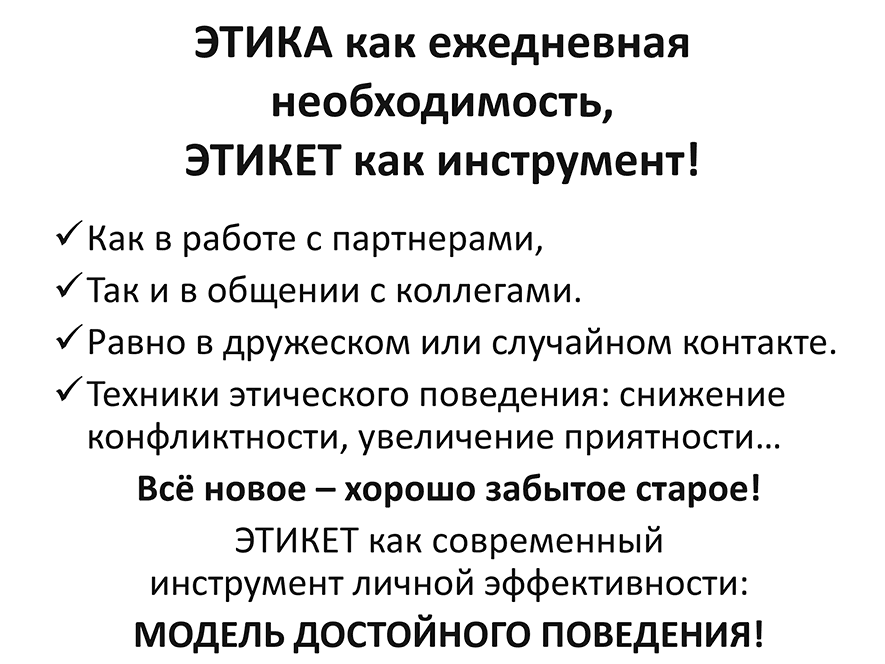 Сколько сотен раз слушатели моих семинаров, участники тренингов и мастер-классов говорили: «Получили множество ответов на вопросы, и даже не могли подумать, что искать надо в теме „этикет“!»