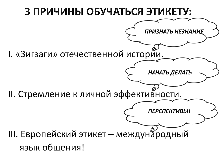 И недальновидно утешаться, что вина «не моя», живу как умею. И, как правилам ПДД, нам – жителям страны с европейским укладом – для уверенного поведения и проявления воспитанности совершенно необходимо ОБУЧАТЬСЯ нормам и правилам общеевропейского этикета.