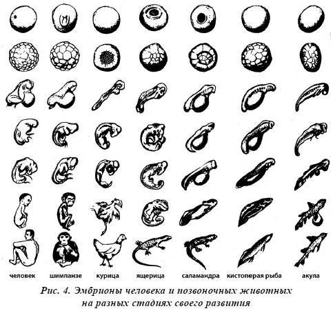 На рисунке 4 хорошо видно, что исходным вариантом эмбрионального развития разных животных может стать эмбриональное развитие человека. Искажения этого развития у животных по отношению к человеческому эмбриональному развитию связаны, прежде всего, с той экологической нишей, которую обживают животные. При этом меняется не только форма тела, появляются нужные приспособления, но и изменяется эмбриональное развитие, чтобы эту форму и приспособления обеспечить. Например, бывшие руки у современных птиц превращаются в крылья еще на стадии эмбриона.